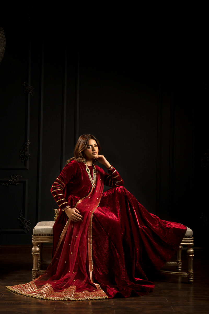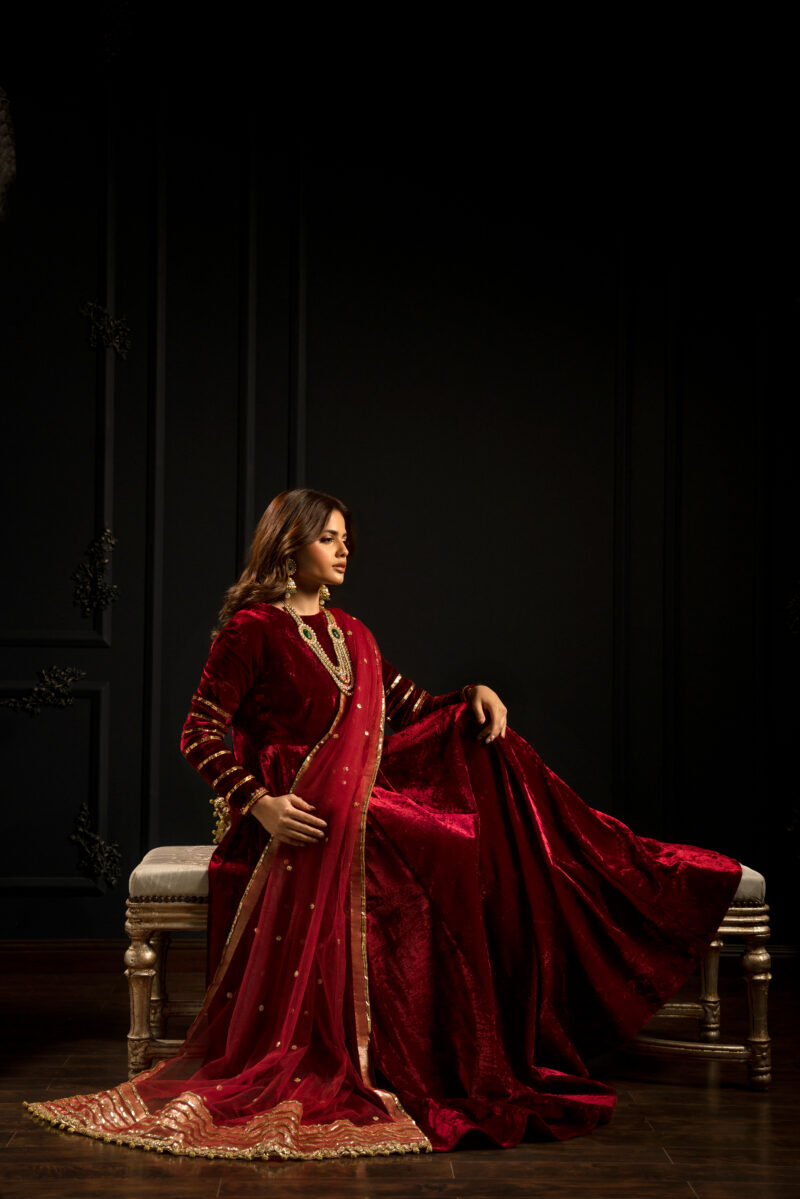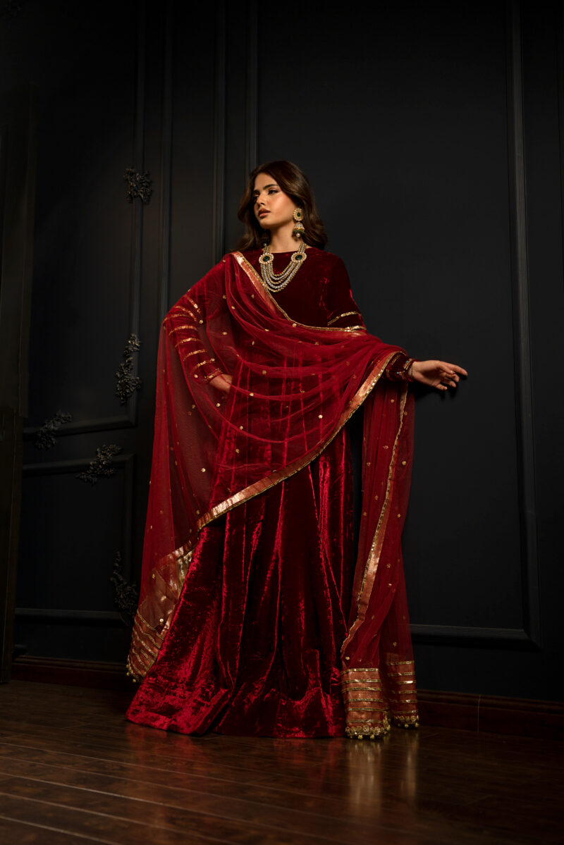 The centerpiece is a floor-length, deep red velvet frock. The structured drape, makes it ideal for creating ethnic luxury and regality.The gown is further detailed with mukaish on the sleeves adding subtle sparkle
