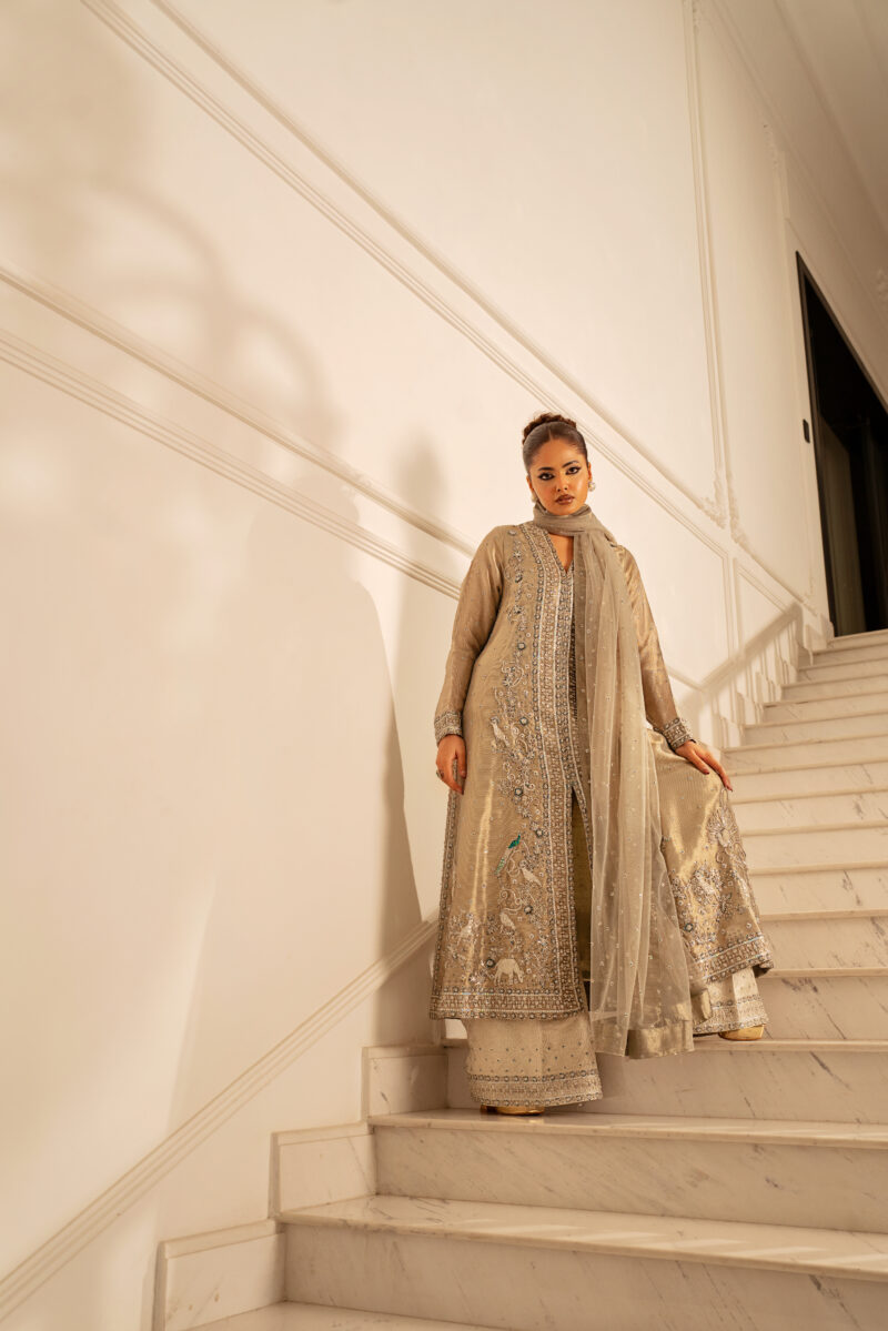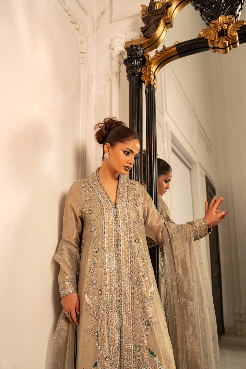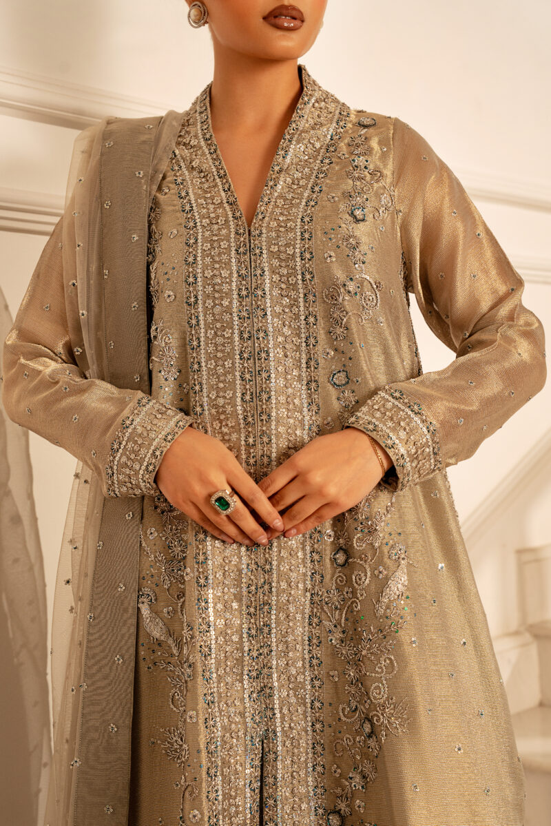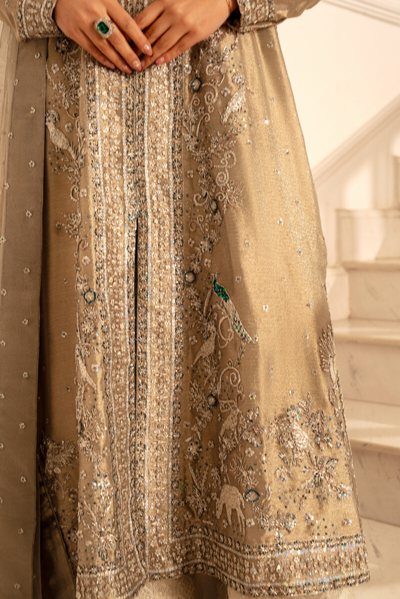 A front-open long shirt crafted from champagne-toned mesh fabric .It features delicate dabka and 3D hand-embellished motifs that creates a shimmering, textured effect