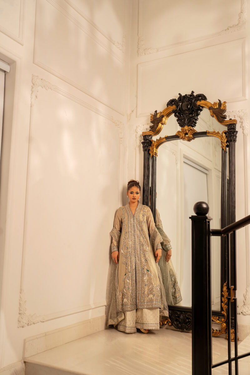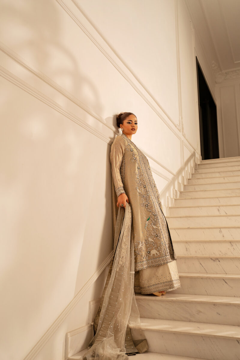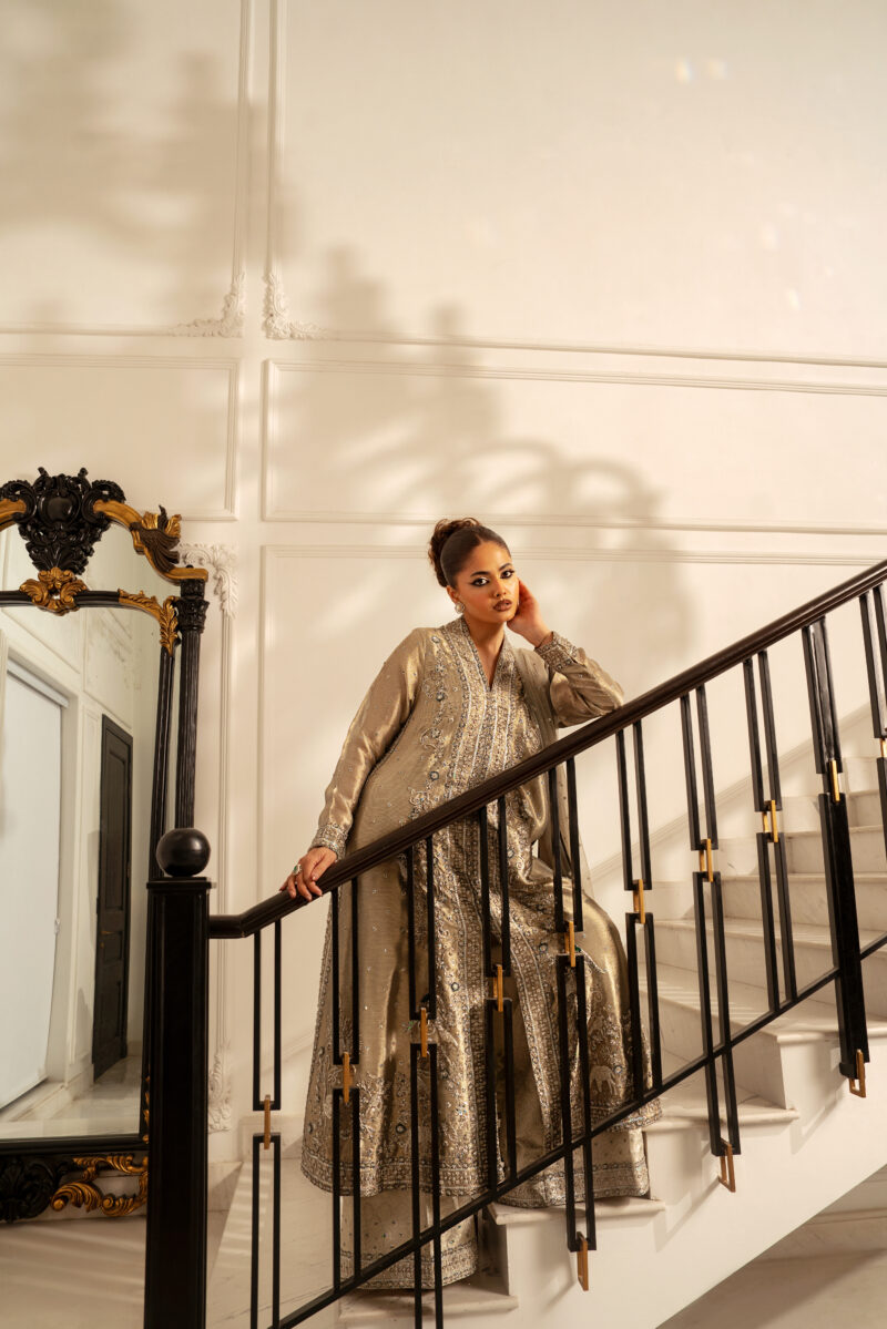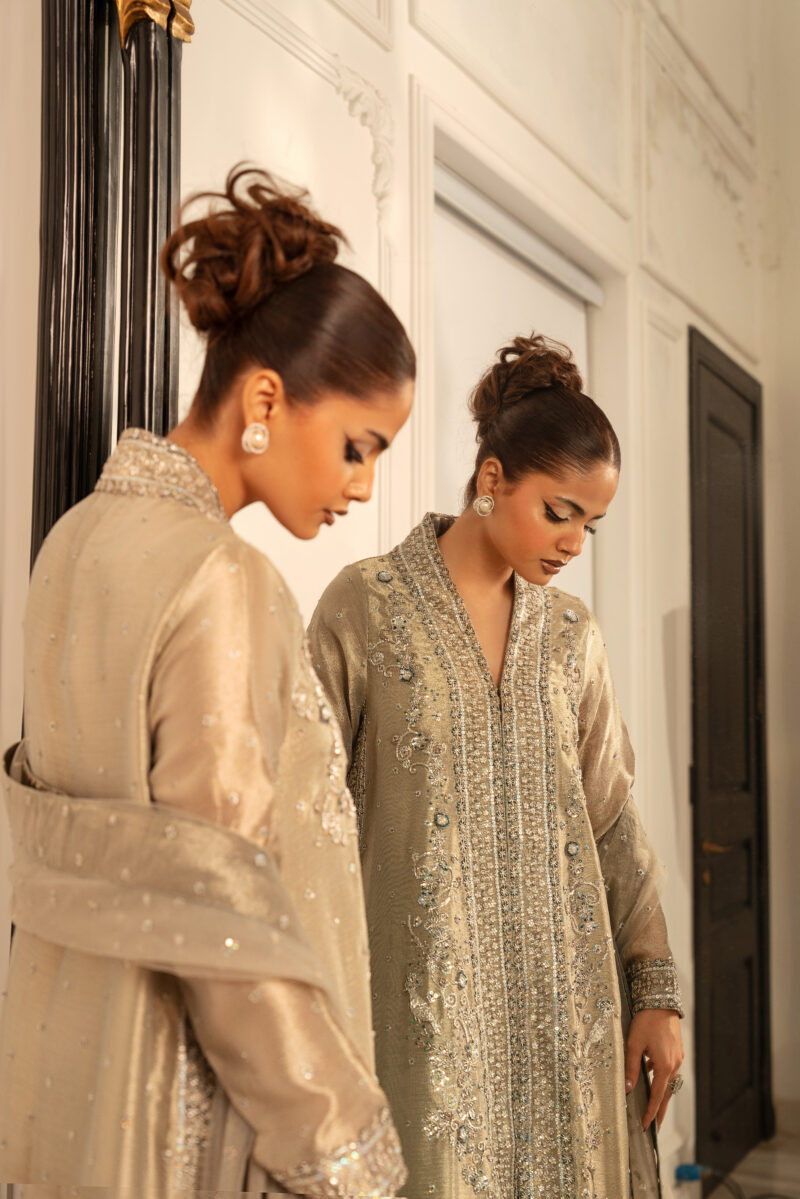 A front-open long shirt crafted from champagne-toned mesh fabric .It features delicate dabka and 3D hand-embellished motifs that creates a shimmering, textured effect