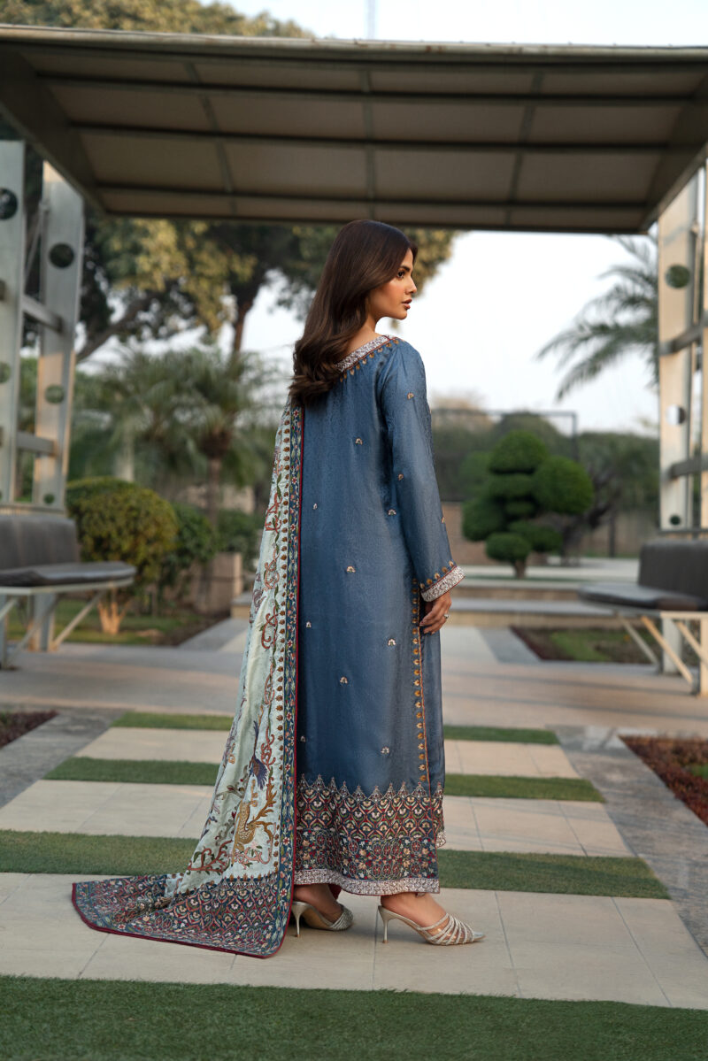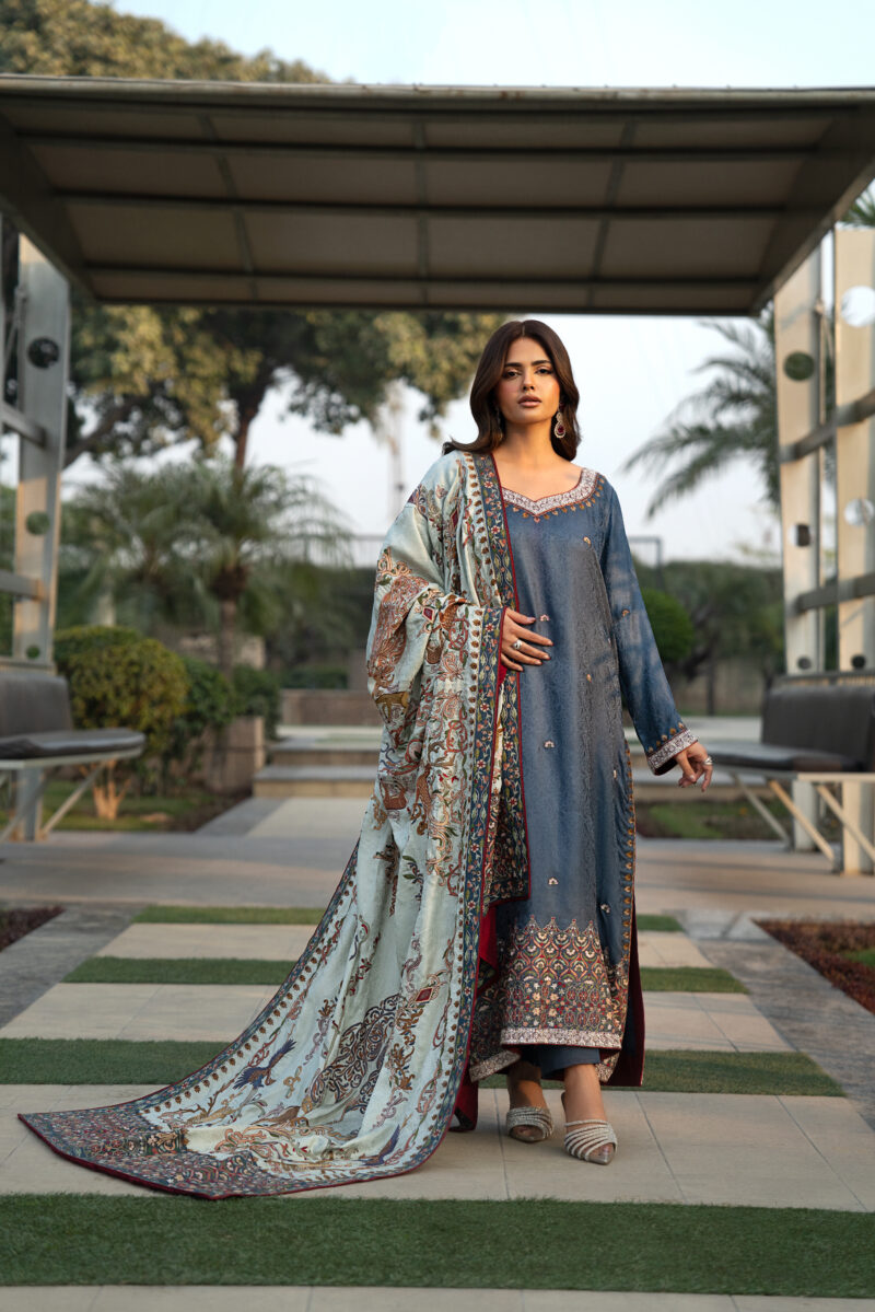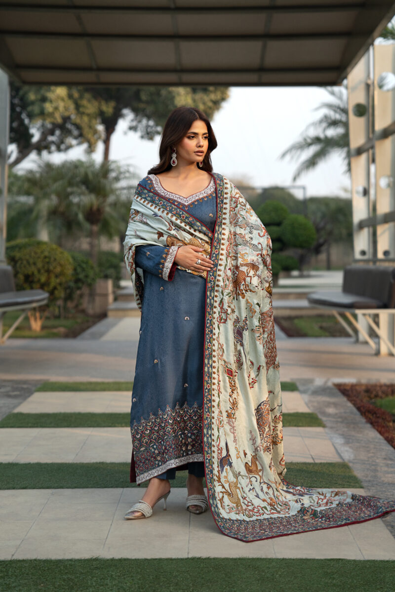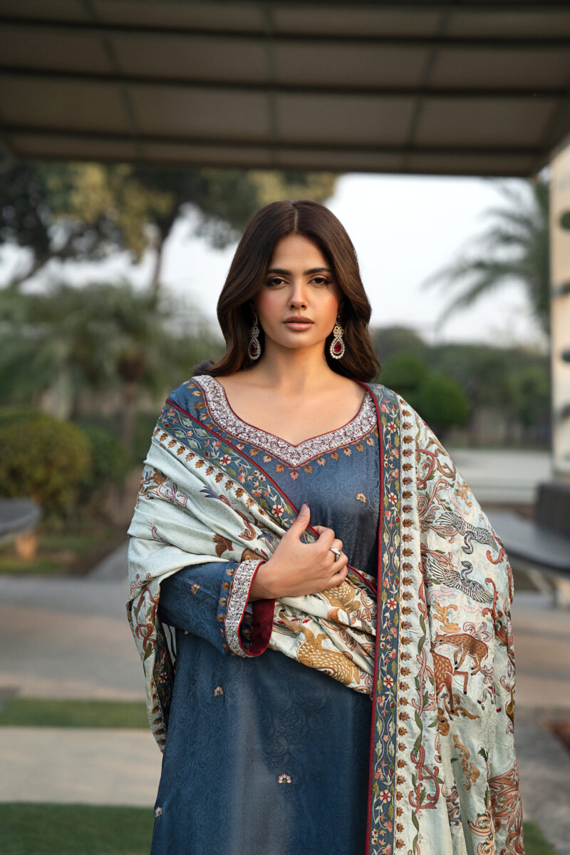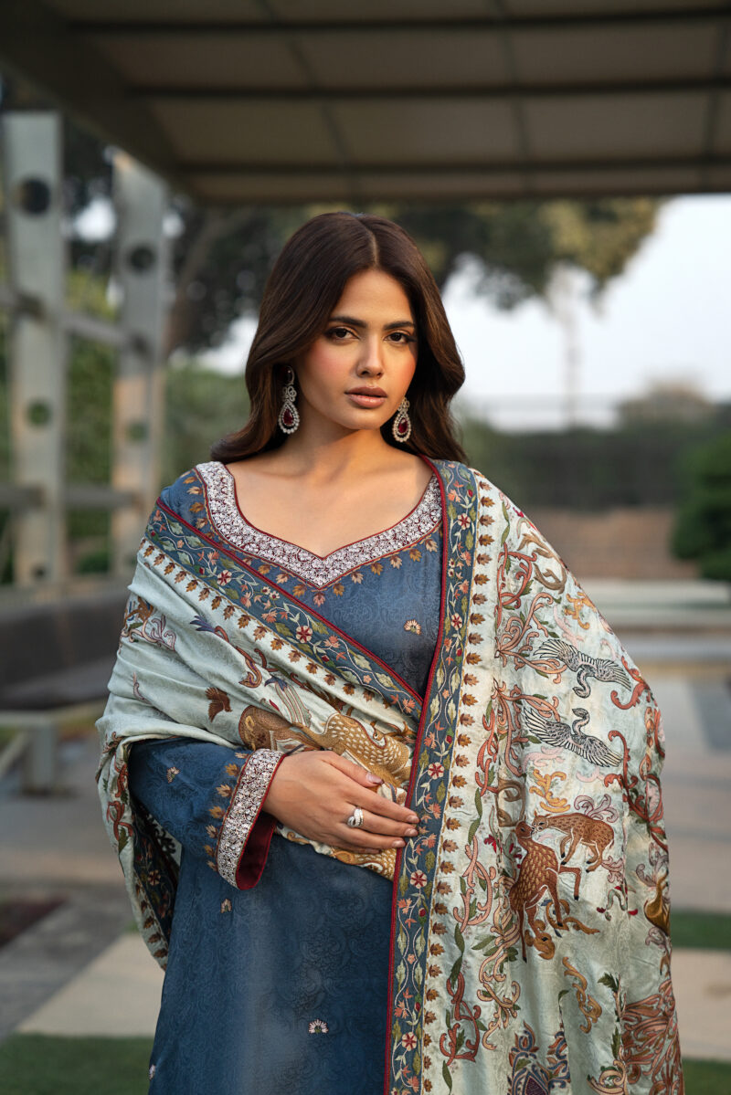 An elegant Shikargah shawl featuring intricate floral patterns with beautifully hand-embroidered deer and birds crafted in fine resham thread. Made from luxurious self Jamawar fabric, this 3–3.15 yard shawl reflects timeless craftsmanship and pairs perfectly with a deep-colored silk shirt enhanced with delicate thread and zardozi work.