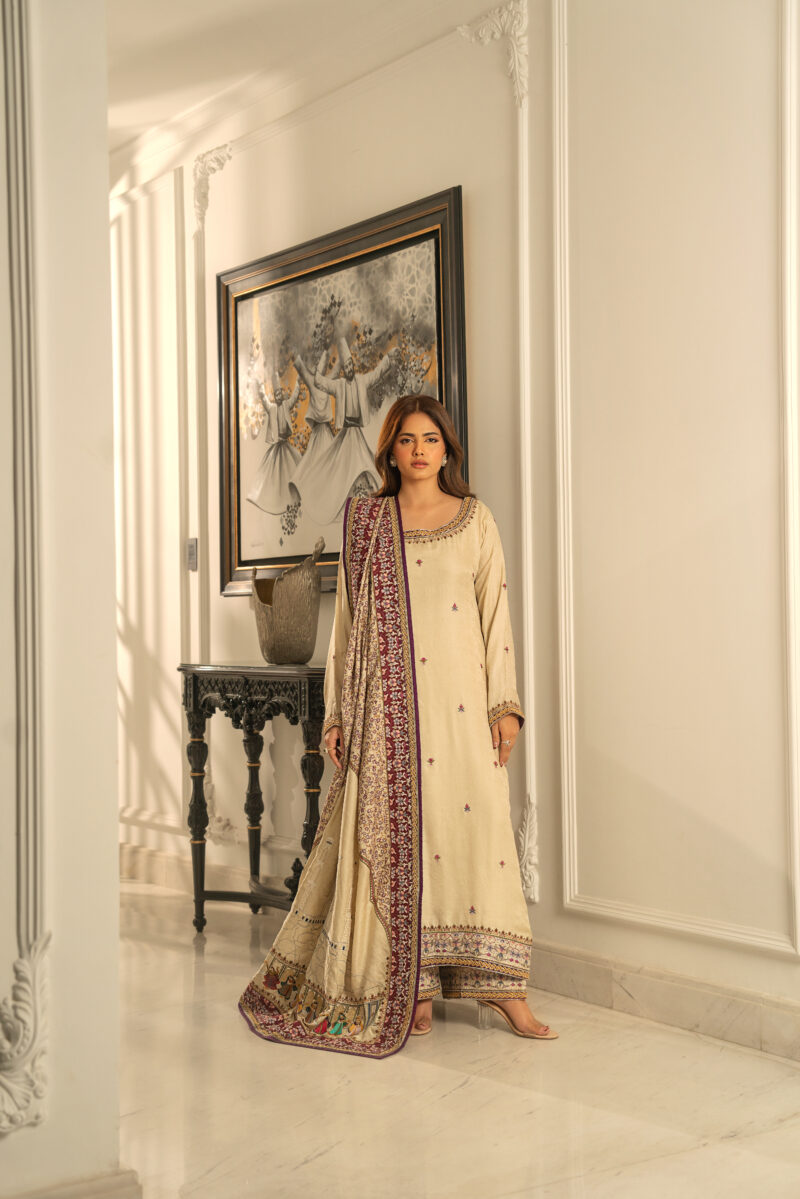 A beautifully crafted piece inspired by the timeless romance of the Mughal era. Featuring delicate resham thread embroidery on self Jamawar with elegant zardozi borders, this design reflects the love story of Shah Jahan and Mumtaz alongside the luxurious lifestyle of the Mughal court. A perfect blend of tradition, artistry, and regal charm.